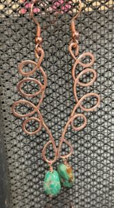 Wire and Textured Charm Earrings – These earrings feature either textured or etched metal charms or shaped wire using copper, brass, nickel silver or sterling silver, with a variety of gemstone or dried gourd drops attached.